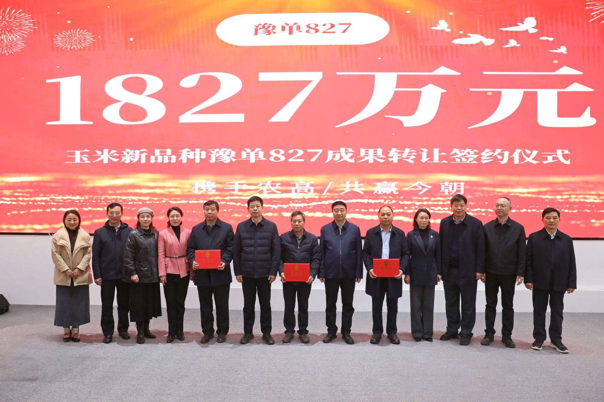 本网讯(记者 黄璞)12月10日,由禁漫 汤继华教授团队培育的玉米新品种豫单827成果转让签约仪式在河南周口国家农高区举行。省总工会教科文卫体工会主席张学勇,校党委副书记、工会主席邹松涛,学术副校长汤继华,周口国家农高区党工委副书记、常务副主任祝俊