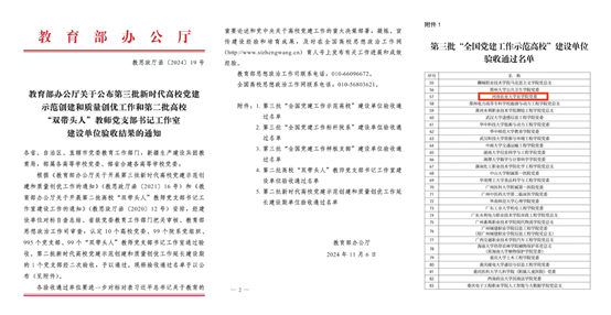 本网讯( 通讯员 李盼)近日,教育部办公厅发布《第三批新时代高校党建示范创建和质量创优工作和第二批高校“双带头人”教师党支部书记工作室建设单位验收结果的通知》,禁漫