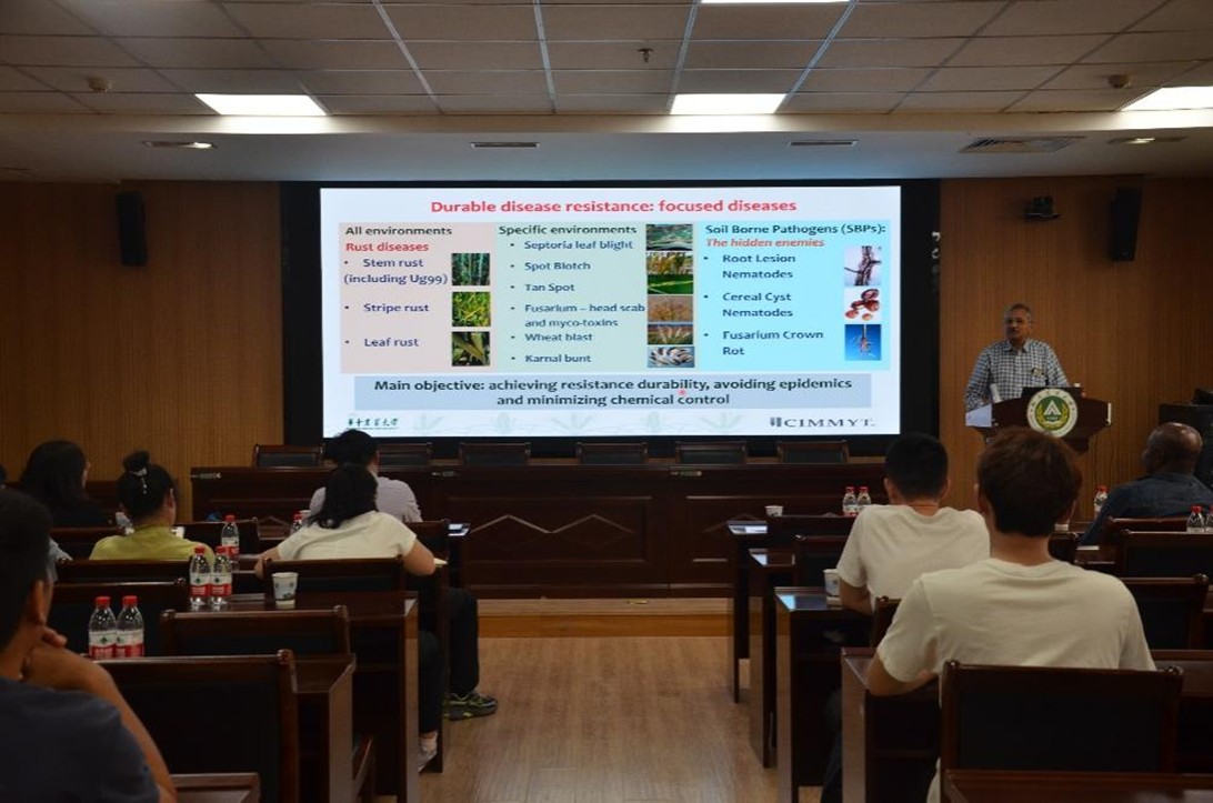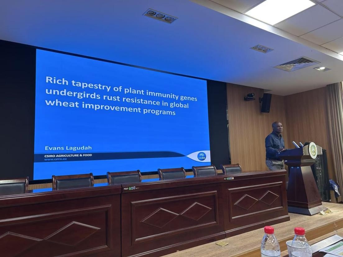 Lagudah院士及Singh博士先后以“Achieving durable rust resistance in practice”和“Rich tapestry of plant immunity genes undergirds rust resistance in global wheat improvement programs”为题开展了第八期CIMMYT-中国小麦玉米科学创新国际论坛主题报告。Singh博士分享了CIMMYT在抗病性基因挖掘、适应性品种推广及发展中国家技术援助方面的实践经验。Lagudah院士则系统介绍了其团队在小麦抗锈病关键基因领域的突破性研究成果。他通过基因编辑技术、分子标记辅助选择等案例,阐释了如何将基础研究转化为实际育种工具,并系统的总结了该领域已报道抗性基因种类及其应用。通过多基因聚合策略实现抗性遗传模块的协同表达,可使植株建立广谱抗病屏障并达到近乎完全免疫的状态,这为应对病原体快速进化及毒性变异挑战提供了关键解决方案。我校禁漫 、生命科学学院部分师生与专家就相关议题展开了交流与讨论。