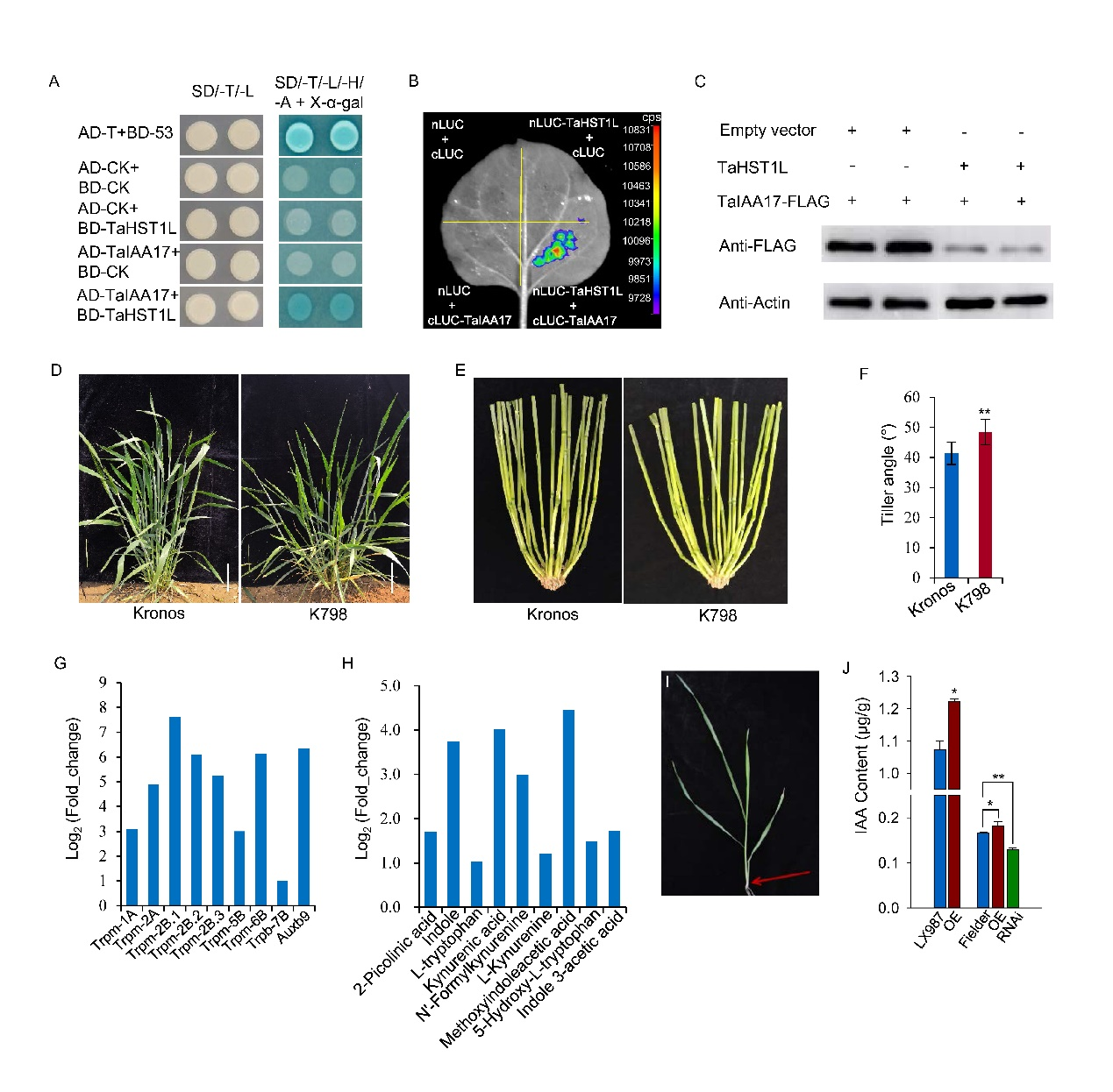 本研究利用全基因组关联分析(GWAS)、BSA混池分析以及BSR-seq方法在小麦5A染色体上定位并成功克隆出TaHST1L基因,并对基因功能进行验证。进一步对其潜在作用机制进行解析,发现TaHST1L同参与生长素信号转导的蛋白TaIAA17存在互作关系,并可能抑制TaIAA17的积累。根据研究结果推测TaHST1L通过与TaIAA17相互作用介导生长素信号转导通路,在调节内源生长素水平方面发挥了积极的关键作用,从而影响小麦分蘖模式。研究对TaHST1L基因序列进行分析,依据变异信息区分为3种基因单倍型,并通过实验证明TaHST1L-A1b为产量优良单倍型。进化分析显示TaHST1L-A1b可能来源于野生二粒小麦,并在栽培二粒小麦和圆锥小麦中经过人工驯化得以保留,且在当前小麦育种中已被强烈驯化,同时也表明TaHST1L具有通过改良株型来提高小麦产量的潜力。