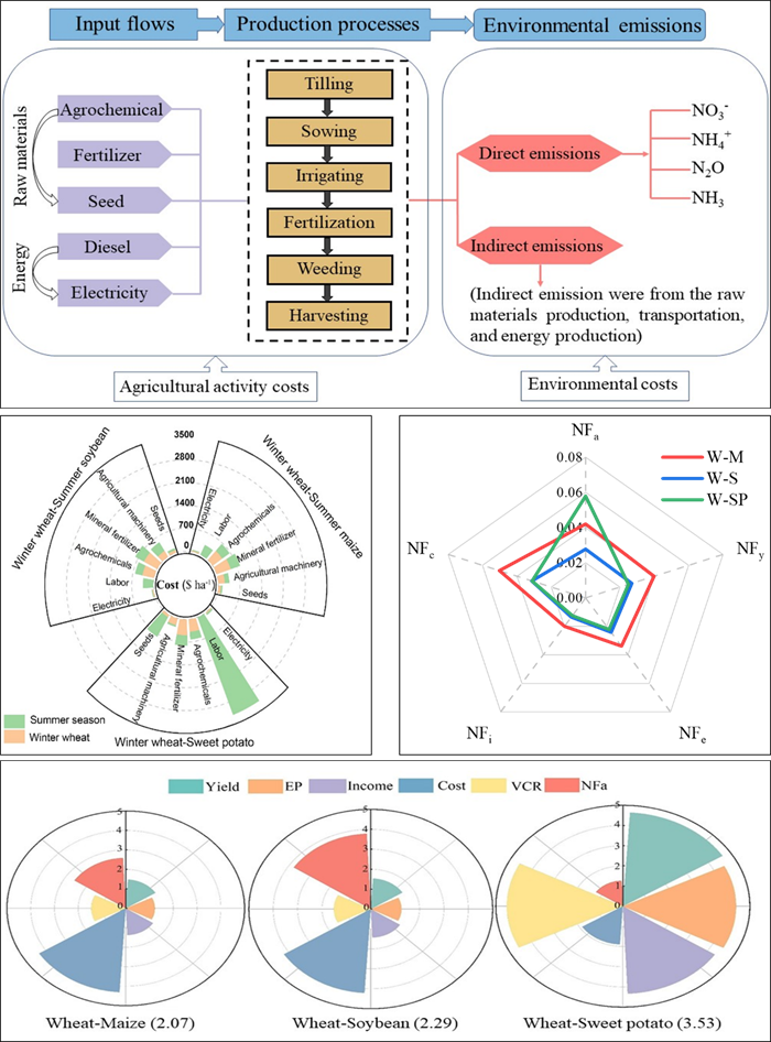 农业生产在碳和氮排放方面发挥着重要作用,其中,甲烷和氧化亚氮排放分别占全球的52%和85%,这些排放对全球变暖和环境污染起到了重要作用。近几十年来,农业活动导致的活性氮排放显著增加,这些排放对农业生态系统造成有害影响,包括土壤酸化、水体富营养化、生物多样性丧失和温室效应等。因此,量化和评估农业生产的碳和氮足迹,并探索有效的缓解策略至关重要。黄淮海平原是中国最大的冬小麦种植区,其年小麦总产量占到79.06%。该地区主要的种植系统是冬小麦-夏玉米轮作,然而,这种种植系统需要高投入的氮肥和水,导致约70%的氮损失。在黄淮海平原使用其它夏季作物(大豆、花生和红薯)与冬小麦复种可以形成不同的生产系统,从而达到减少氮素污染的目的。然而,从氮足迹的角度全面评估不同的生产系统仍不清楚,为加深对以小麦-玉米轮作为主导的种植系统向环境友好的种植系统转型的理解。