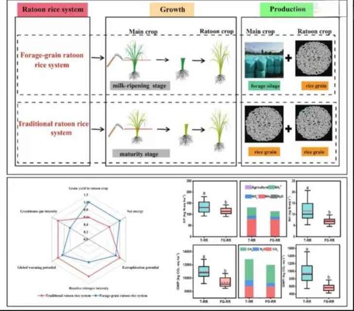 本研究采用生命周期评估的方法,探讨了粮饲型再生稻和传统再生稻在再生稻适宜和次适宜种植区的综合效益,明确了粮饲型再生稻提高了能值输出(37%)和能值利用率(37%),同时降低全球增温潜势(-17%)和富营养化潜势(-13%),且环境效益的提升主要得益于甲烷(-14.89%)、铵态氮(-33%)和硝态氮(-25%)等活性氮排放的降低。同时,粮饲型再生稻在河南信阳和安徽池州再生稻次适宜种植区展现出更高的作物增产潜力,产量增幅达91%-152%,且安徽池州经济效益增加更为显著。该研究为再生稻次适宜种植区再生稻的可持续发展提供了新的方向。