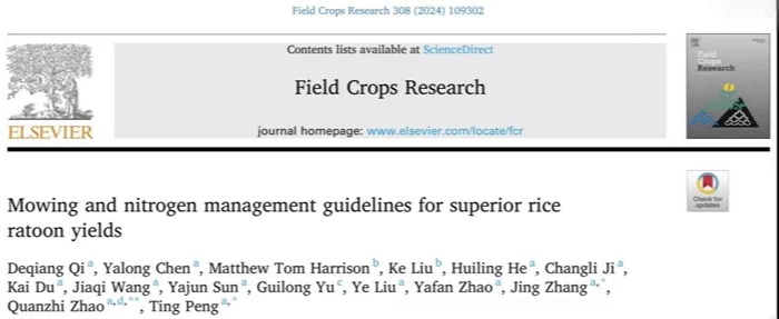 2024年2月,该团队在作物栽培学权威期刊《Field Crops Research》在线发表了粮饲型再生稻产量形成的生理生态机制相关研究,明确了抽穗至乳熟期刈割显著提高了再生稻的产量,尤其是抽穗期刈割可以使产量提高2.2倍,且早期刈割有利于增加稻桩干重和非结构性碳水化合物的含量,增加再生季水稻的温光资源配置。同时,最佳刈割时期与适宜氮肥处理相结合,有助于提升水稻的再生能力、改善再生季水稻的群体结构,进而增加再生稻的产量。