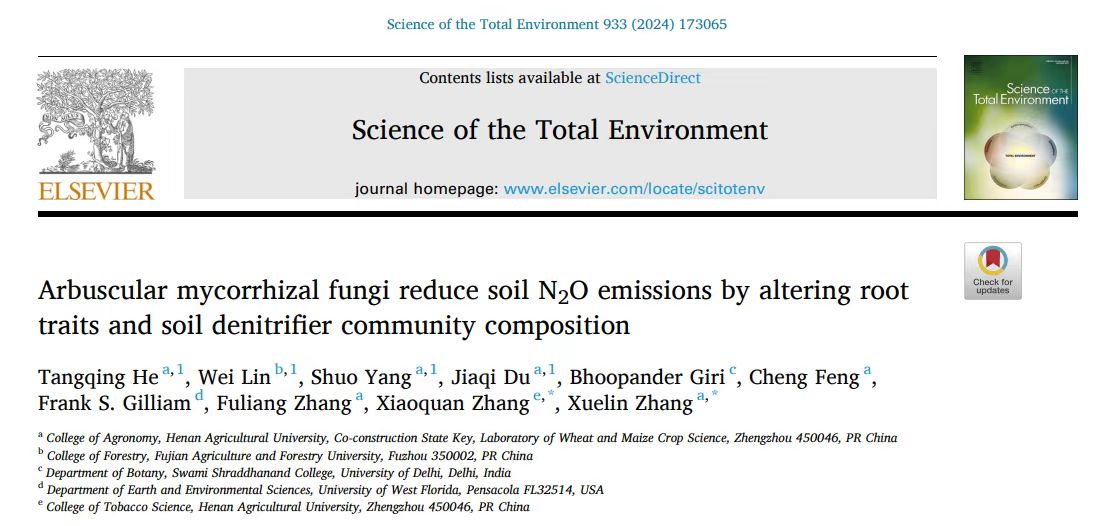 张学林教授团队在环境科学领域Top期刊《Science of The Total Environment》发表了题为“Arbuscular mycorrhizal fungi reduce soil N