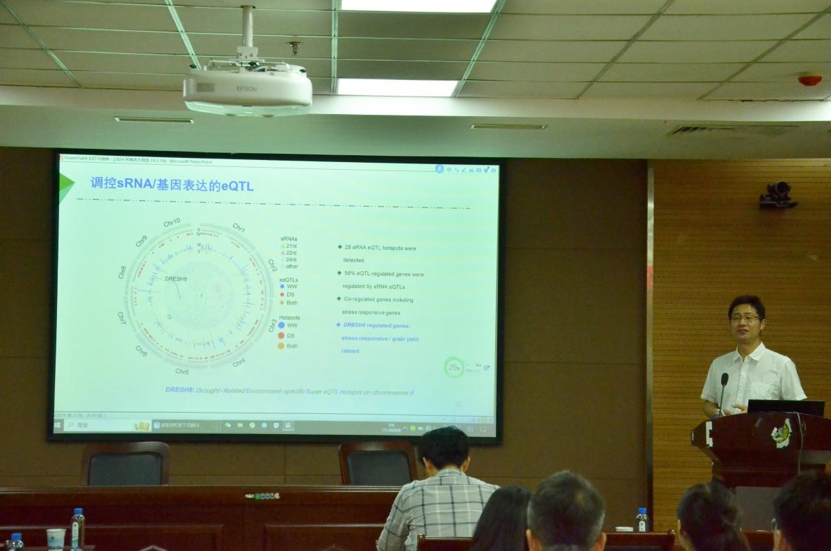代明球教授主要介绍玉米全基因组范围响应干旱胁迫的sRNA并揭示了其遗传调控机制;详细介绍了eQTL热点DRESH8相关研究,以及发现DRESH8是一个调控玉米抗旱性和产量平衡的关键遗传位点的背后故事。