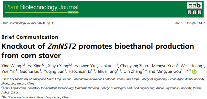 ZmNST2 promotes bioethanol production from corn stover”的研究论文。该研究发现,玉米