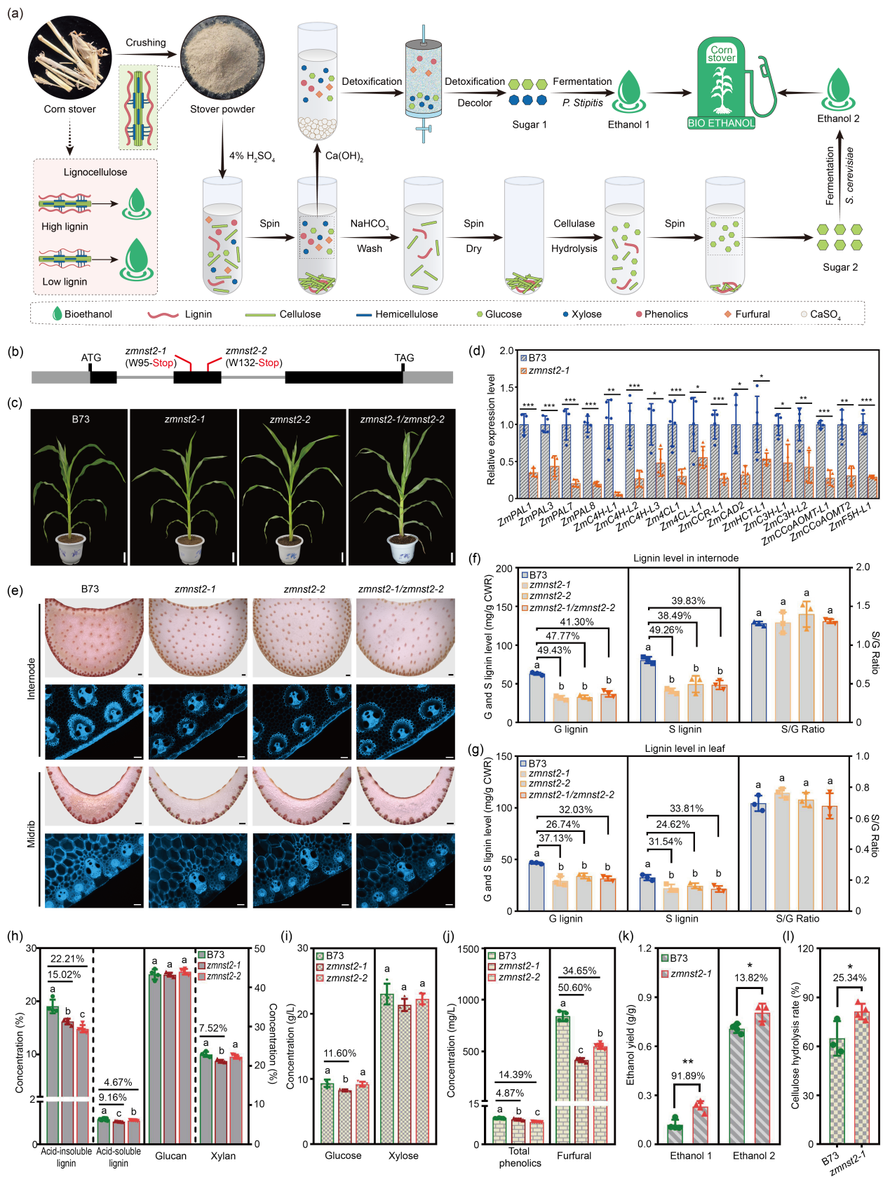 ZmNST2的突变使玉米木质素含量显著减少,进而降低了发酵抑制物的含量,增强了纤维素水解酶对纤维素的水解作用,使玉米秸秆发酵产生生物乙醇的效率显著提高。综上,该研究发现