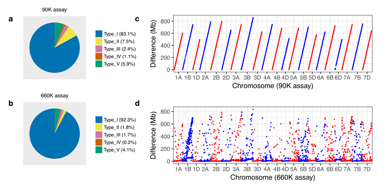 a-b:小麦90K和660K芯片中5种标记百分比;c-d:更新前后物理位置之间差异