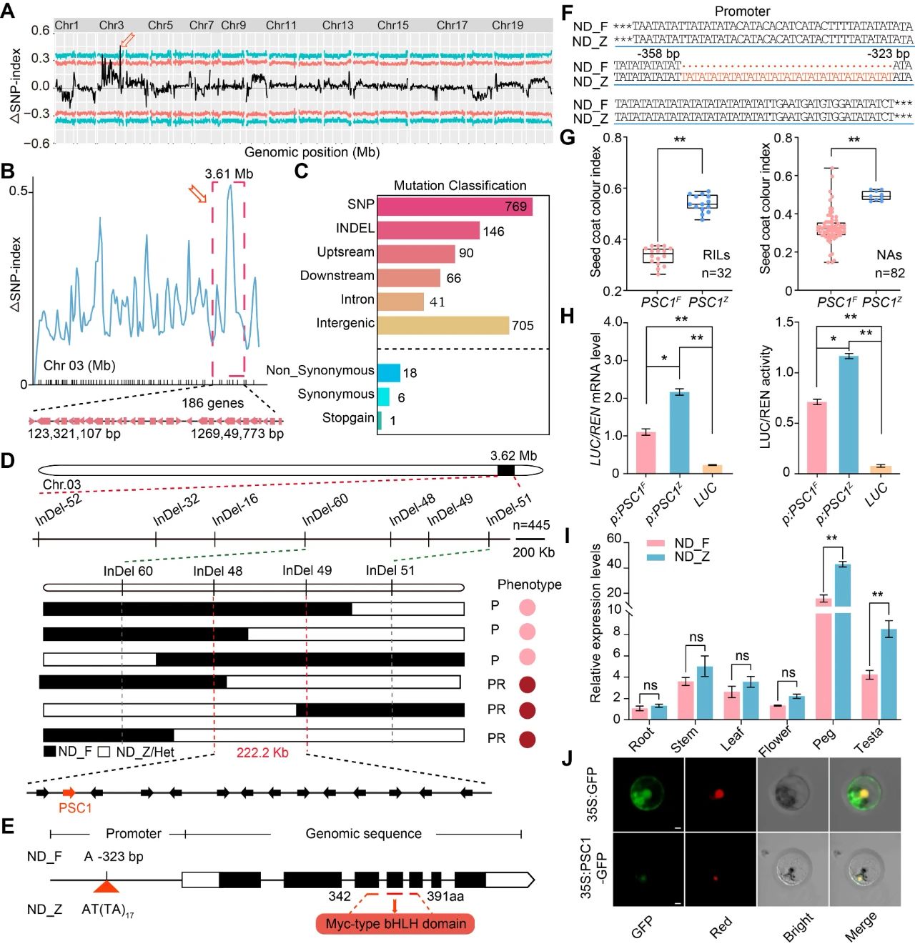 PSC1, a basic/helix-loop-helix transcription factor controlling the purplish-red testa trait in peanut”的研究成果。该研究报道了控制紫红色种皮的重要基因