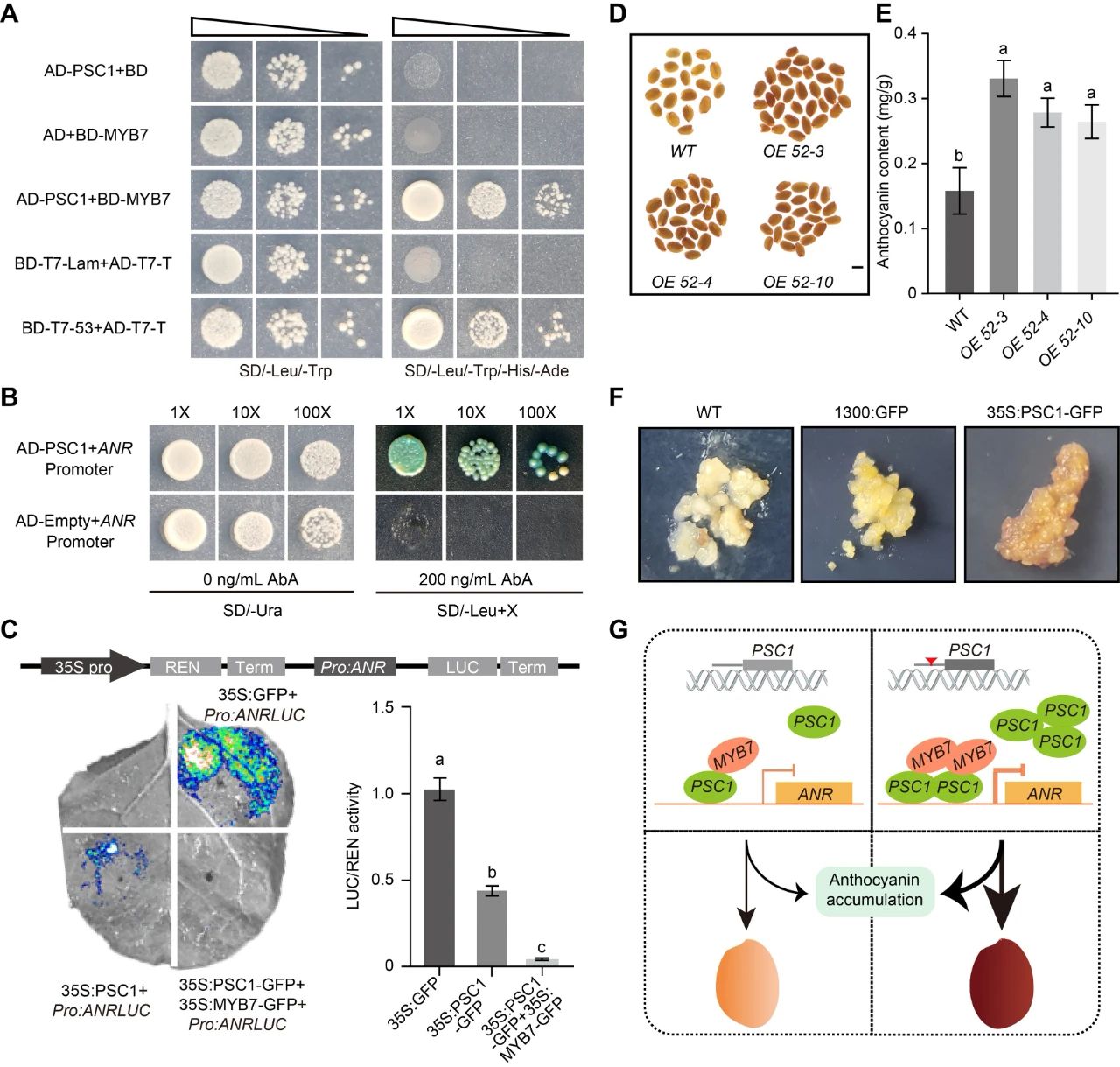 PSC1,能够与AhMYB7形成复合物,共同抑制花色素还原酶ANR的表达,从而调控花生种皮中花色苷的含量。