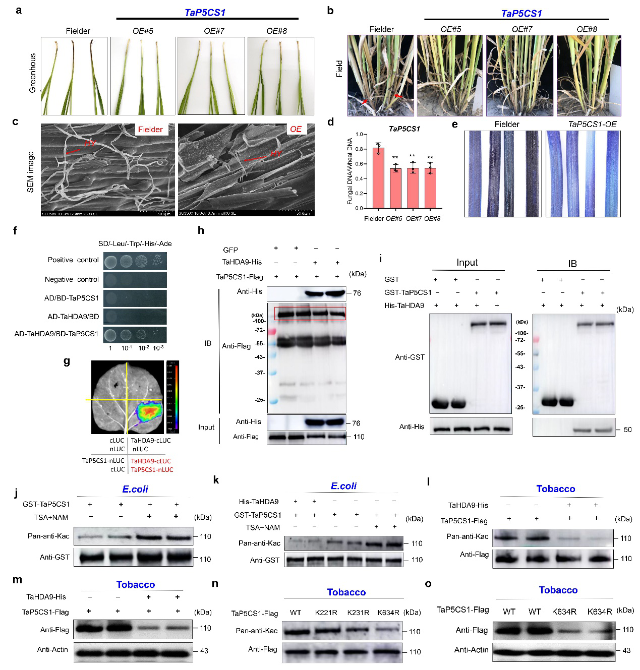 小麦茎基腐病 (FCR) 是一种全球性土传病害,近年来世界各地不断蔓延和发展,严重威胁小麦生产安全和人民健康。借助于多组学,作者发现了一个独特的蛋白质模块TaHDA9-TaP5CS1,研究结果表明,F. pg侵染降低了抗FCR小麦植株中TaHDA9的表达,从而通过解除TaHDA9的乙酰化限制增加TaP5CS1的表达,导致脯氨酸含量增加,进而增强了小麦对FCR的抗性。