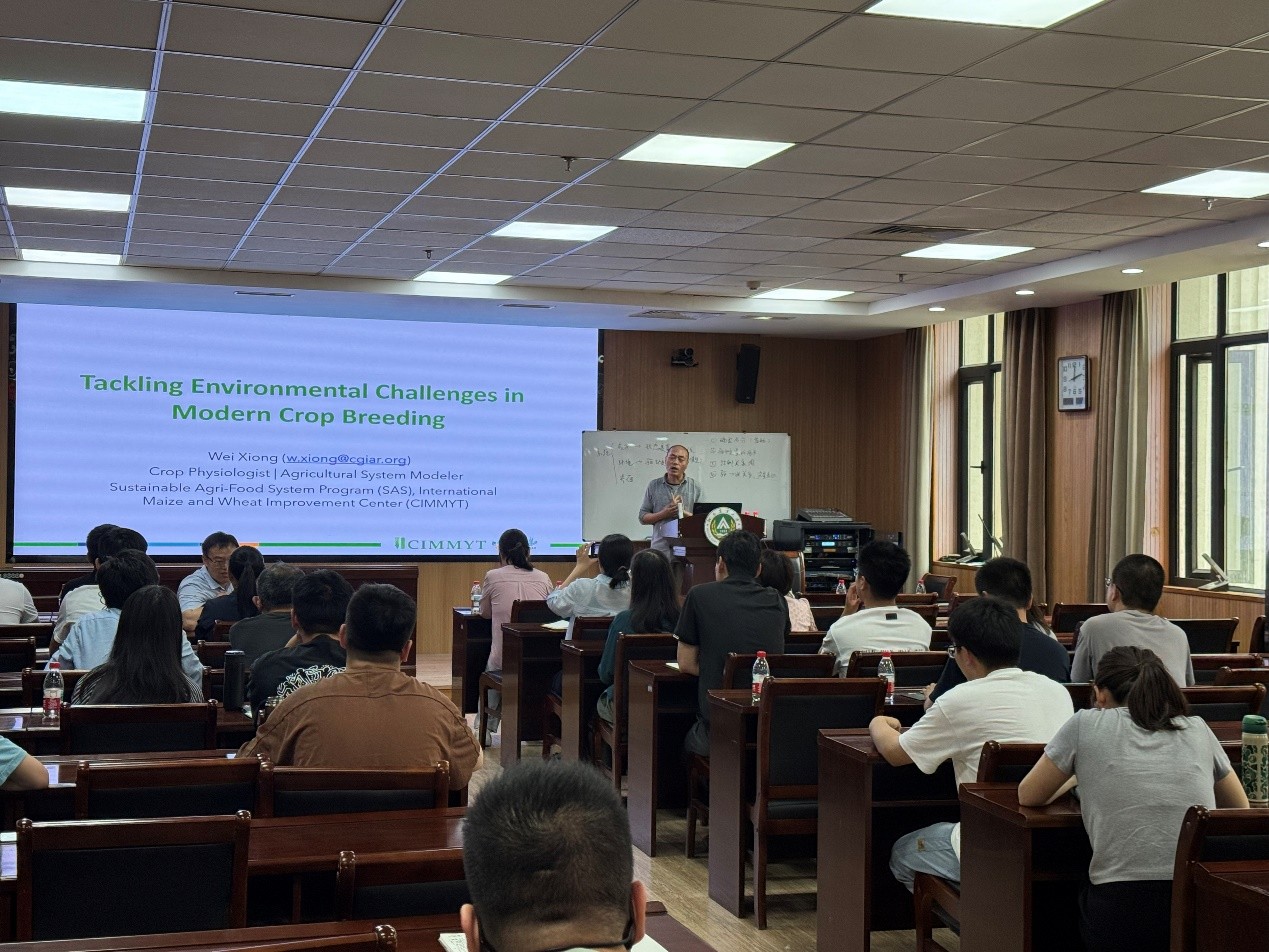 熊伟研究员以“Tackling Environmental Challenges in Modern Crop Breeding”为题,系统介绍了气候变化背景下CIMMYT的育种策略,主要包括CIMMYT的发展历史、可持续农业发展、气候变化对育种的挑战、作物模型及挑战。并积极鼓励我校学生到CIMMYT开展学习交流,提升我校国际合作水平。