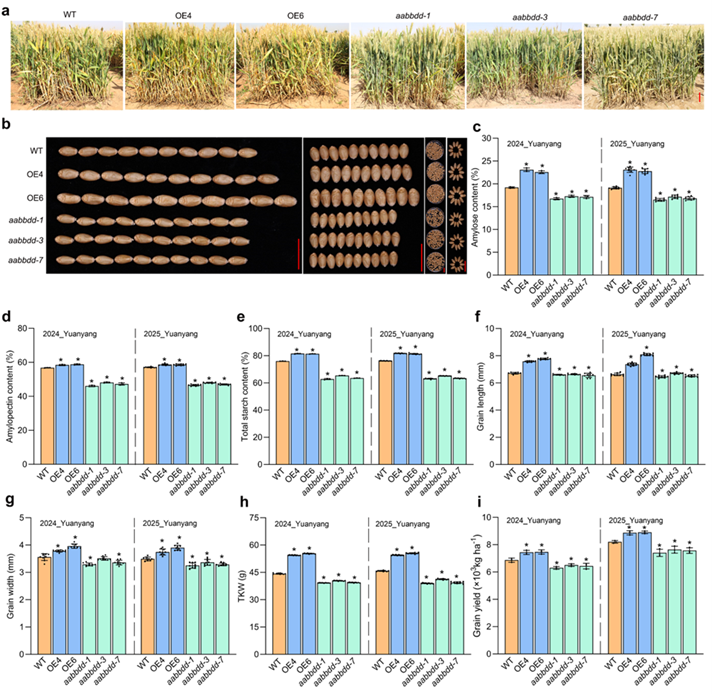 腺苷葡萄糖焦磷酸化酶(AGPase)是控制作物淀粉合成的关键酶,该团队发现bHLH转录因子家族一个成员—TaPIL1能与淀粉合成酶胞质型小亚基基因(TaAGPS1a)启动子结合,该基因的基因编辑和过量表达两类转基因材料的籽粒淀粉含量、粒重及产量发生了显著变化,表明TaPIL1能正向调控小麦籽粒淀粉的合成,进而提高了粒重和籽粒产量(图1)。
