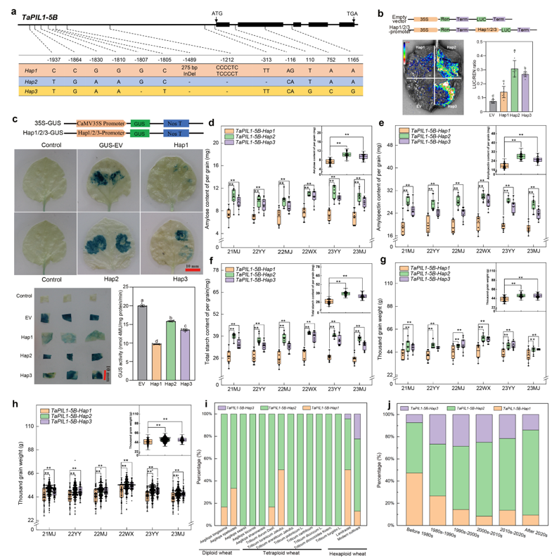 在351份六倍体小麦及其近缘种中,发现TaPIL1-5B启动子和编码域内存在13个等位变异,分为3种单倍型(Hap1-3)。通过比较千粒重和启动子活性,发现Hap2/3为控制籽粒淀粉合成的优异单倍型(图4)。Hap2/3品种PIL1启动子上275 bp的缺失,造成了一个转录抑制子TaBZR1.1不能与其结合,从而提高其驱动淀粉合成基因表达的能力。