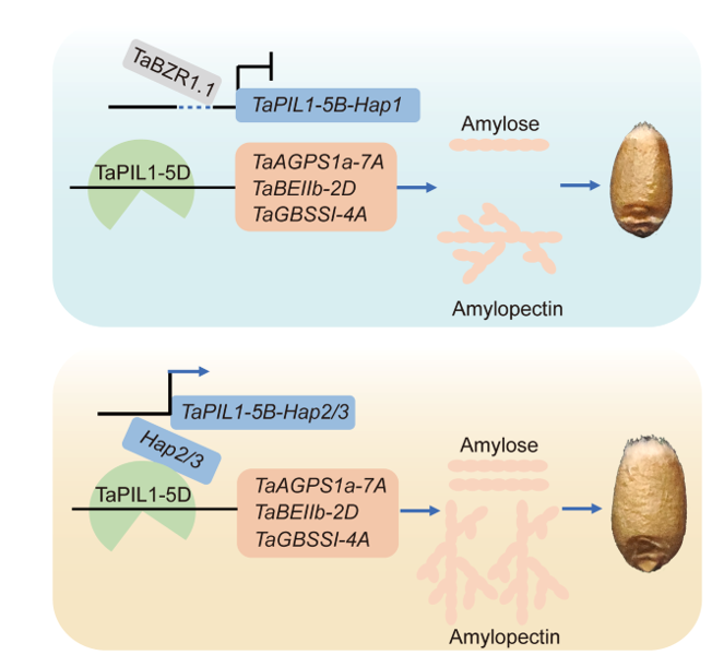 本研究提出了TaPIL1调控小麦籽粒淀粉合成的模型:TaPIL1-5D通过驱动TaAGPS1a、TaBEIIb-2D和TaGBSSI-4A表达,调控了小麦籽粒淀粉的合成;TaPIL1-5B与-5D形成二聚体,增强后者转录激活能力;TaPIL1-5B-Hap2/Hap3启动子上存在275 bp片段缺失,造成转录抑制子TaBZR1.1不能与其结合,提高了TaPIL1-5B的表达,增强了小麦籽粒淀粉合成能力(图 5)。