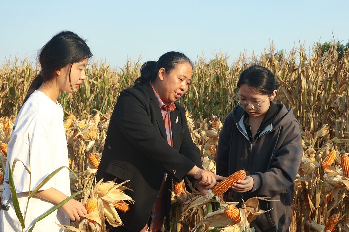 玉米秋成晒满场,长杨丛立守其旁。沿着基地小路,师生们走进基地实验田。王群教授在田间为各位师生科普了玉米高质量导航播种和生产管理知识,对比讲解了试验田中不同品种特点,并在指导下深入田间,对玉米根(气生根)生长、果穗的穗行数、结实性和化控植株的效果等进行了仔细观察。