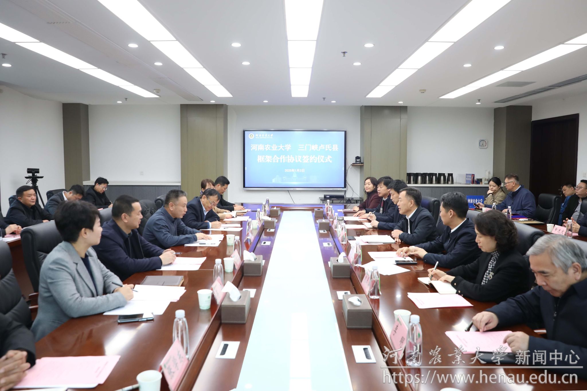 本网讯(通讯员 王萌 夏至 图片 黄璞)1月3日,学校与卢氏县人民政府框架合作协议签约仪式在龙子湖校区举行。校党委书记李成伟、副校长刘晓永,卢氏县委书记胡志权出席座谈会。校党委办公室、人事处、社会服务处、禁漫