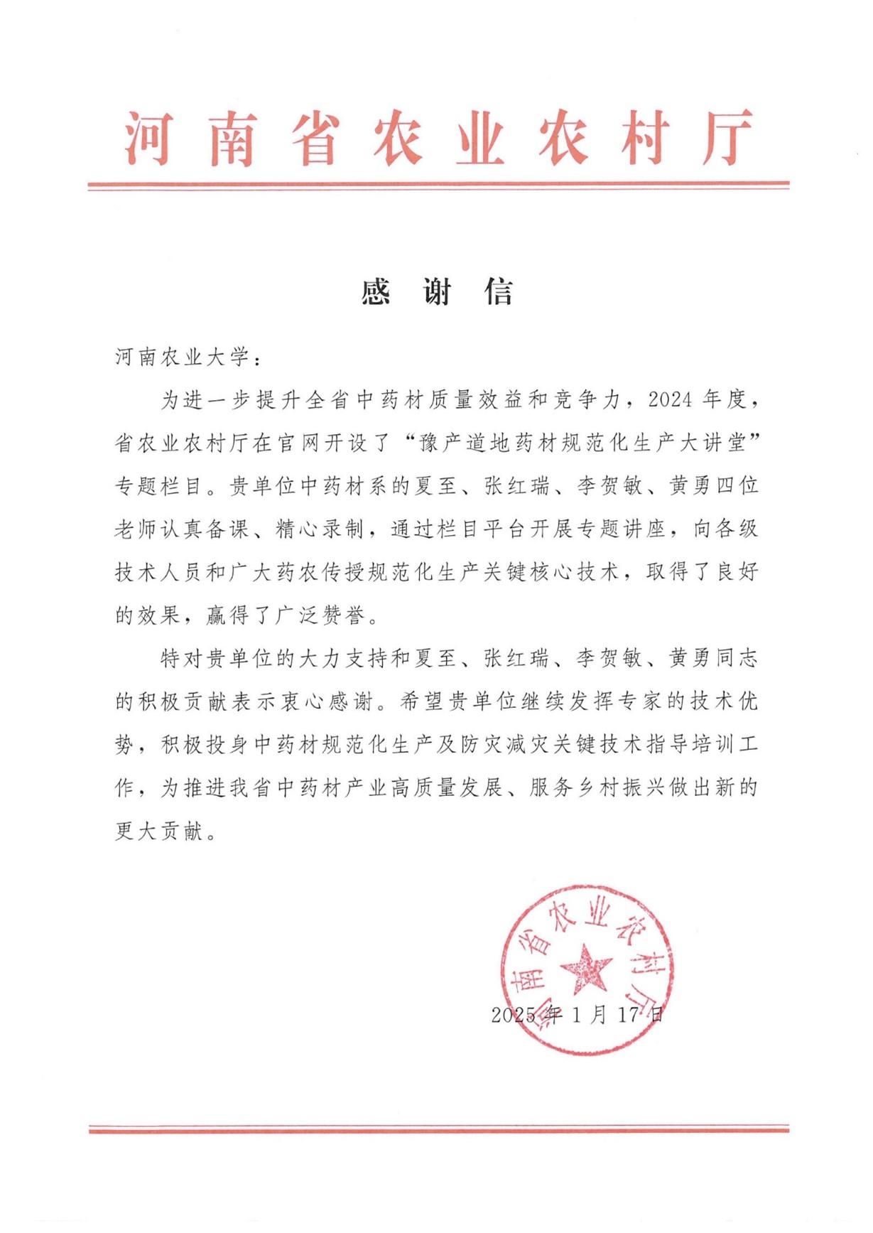 本网讯(通讯员 夏至)新年伊始,万象更新。1月17日,河南省农业农村厅向我校发来感谢信,感谢禁漫