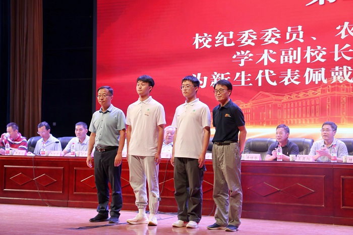 党委书记马菲,学术副校长、院长王道文,为新生代表佩戴禁漫