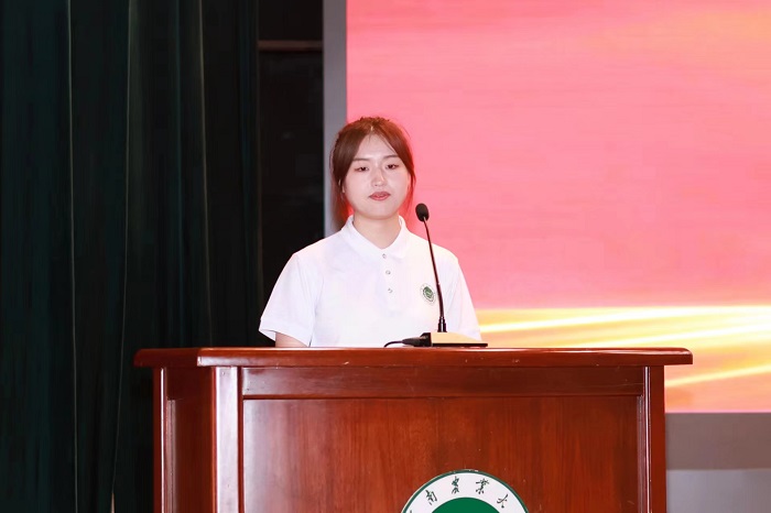 本科生高年级学生代表2020级农学2班牛瑞利同学发言。她回忆自己的大学生活,深刻阐述自己对农学专业的见解,与学弟学妹们共勉 。她表示大学不是终点,而是新的起点,既要享受大学时光,更要明确人生目标,要用心摸索出适合自己的道路。