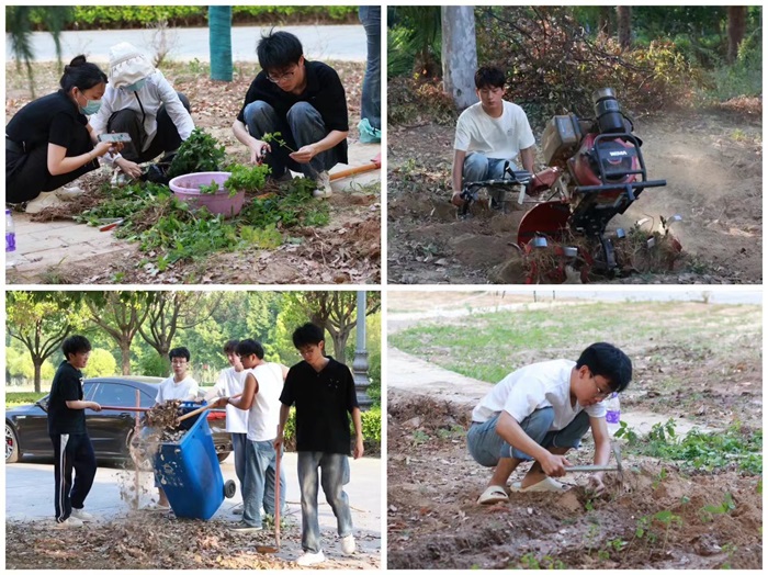 于龙子湖校区A、B座繁塔楼后方开辟菊花园,恰值劳动周,中药学专业学生正播撒菊花种子,浇水施肥,以待花开。