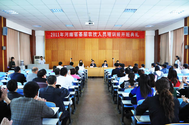 5月12日上午,“2011年河南省基层农技人员培训班”开班典礼在图书馆报告厅举行。地方合作处、禁漫 相关负责人以及来自周口、许昌的100余名学员参加了开班仪式。 作为“2011年河南省基层农技人员培训基地”,今年我校承担了657人的培训任务。本期基层农技人员培训班由禁漫 承办,以小麦栽培技术为主要内容,通过专题讲座、现场实习和参观考察相结合等方式,对学员进行为期5天的培训。 典礼结束后,禁漫 贺德先教授以《小麦高产栽培技术》为题,给学员们上了第一堂课。