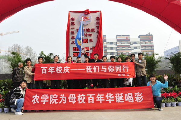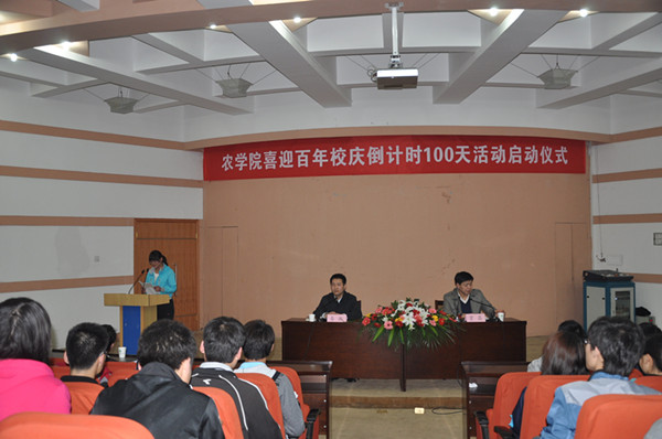学生代表郭帅军宣读校庆倒计时100天倡议书,号召大家努力做到再读校史,重温母校百年办学历程;践行校训,弘扬农大朴实无华精神;学农爱农,立志终身服务三农事业;文明修身,争树农大学子良好形象;志愿服务,积极参与各项筹备活动;热情主动,喜迎学长学姐荣归母校。