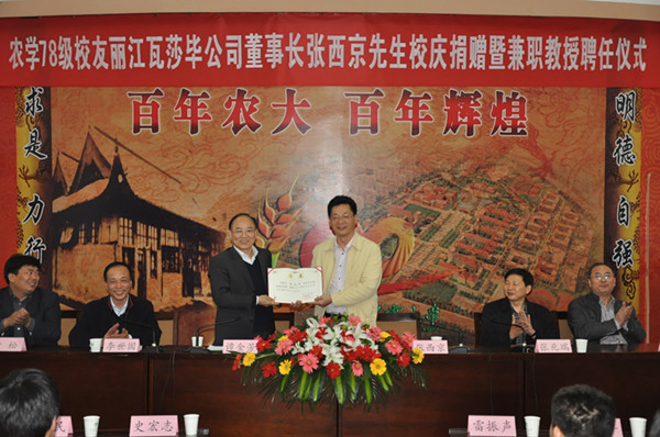 2012年4月12日下午,农学78级校友丽江瓦莎毕公司董事长张西京先生校庆捐赠暨兼职教授聘任仪式在三百人报告厅隆重举行。副校长、校庆筹委会副主任谭金芳出席,校庆办公室常务副主任李世国、计划财务处处长张兆瑞、禁漫