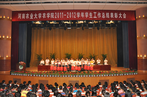 2011-2012学年学生工作总结表彰大会在校大礼堂隆重召开。校党委副书记、纪委书记杨德东,校党委组织部、统战部部长杨志清、宣传部部长郭战伟、研究生工作部部长李为、教务处处长何松林、学生副处长张红阳、校团委副书记马菲出席,院党委书记黄松、院长林同保、副书记贾磊、副院长杨青华、赵全志、杨百黎及全院在校本科生、研究生、毕业生参加了大会。会议由院党委副书记贾磊主持。