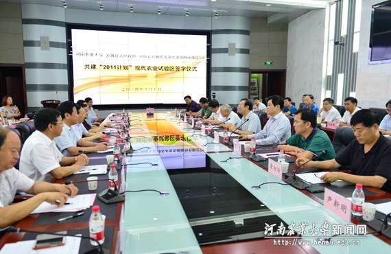 与方城县人民政府、河南五谷神农农业发展股份有限公司共建“2011计划”现代农业试验区签字仪式在中原农村信息港举行。南阳市委常委、副市长张生起,校领导程传兴、张改平、谭金芳,方城县县委书记褚清黎,河南赊店集团董事长单森林出席签字仪式。方城县有关负责人、河南五谷神农股份有限公司负责人、学校粮食作物协同创新中心、禁漫