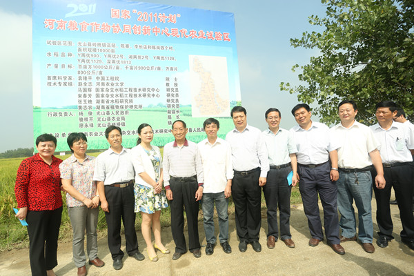 河南粮食作物协同创新中心与国家杂交水稻工程技术研究中心战略合作的重要内容,也是协同完成袁隆平院士主持的“总理项目”的核心区之一。试验区以超级杂交稻“百千万”高产攻关示范为载体,利用三年时间实现“百亩方亩产1000公斤、千亩方亩产900公斤和万亩方亩产800公斤”的高产攻关目标。在考察现场,赵全志教授向袁隆平院士一行简要介绍了两个中心在协同创新、联合培训、技术指导、共同组织超级杂交稻生产方面的具体做法,袁隆平院士对超级杂交稻协同创新的攻关模式给予了充分肯定,对超级杂交稻的田间长势给予了高度评价,认为有望完成预期目标任务。