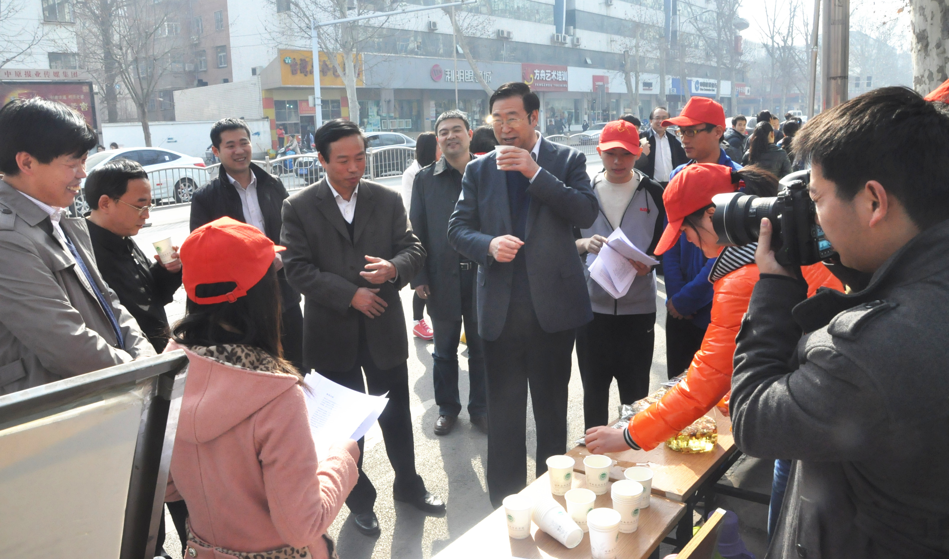 在学校东门口,中药养生协会的学生在这里设立服务点,向过往的行人赠送特地泡制的花茶,并向他们耐心讲解一些春季养生知识,提醒他们合理调节,促进身心健康。上午10时许,校党委书记程传兴、副书记杨德东等一行来到服务站看望大家,并高兴地品尝了同学们端上的茶水。