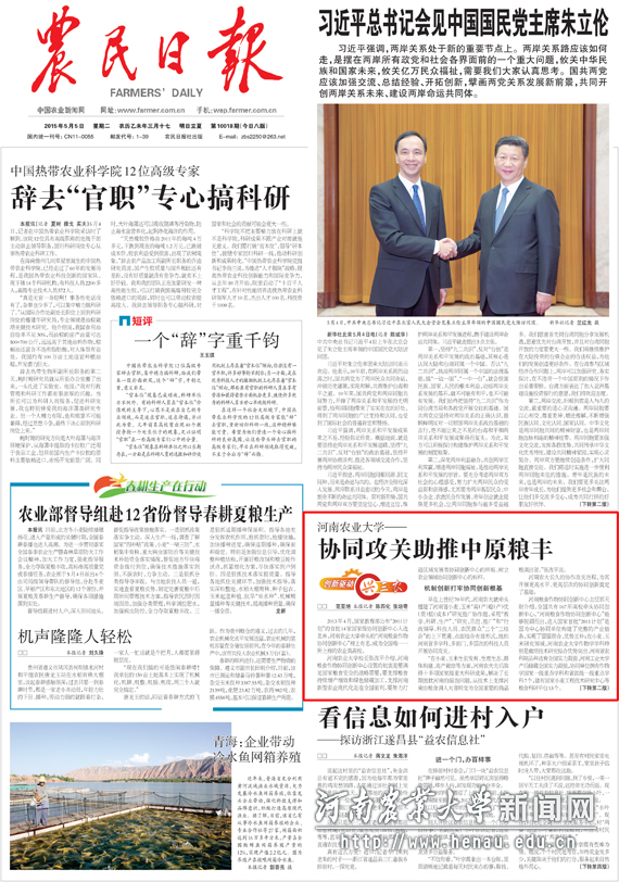 编者按:党的十八大以来,中央对实施创新驱动发展战略作出了一系列战略部署。根据中宣部要求,农民日报结合自身特点开展了“创新驱动兴‘三农’”专题宣传报道活动。该项活动在全国13个省(直辖市)选取了13个农业科研院所或农业大学,重点宣传他们在深化体制机制改革、实施创新驱动发展战略方面的突出亮点,宣传他们的典型经验、成功做法、有益探索及生动实践。我校由于在协同创新、支撑国家粮食安全方面的突出贡献,名列其中。5月5日,农民日报在头版显著位置以“禁漫