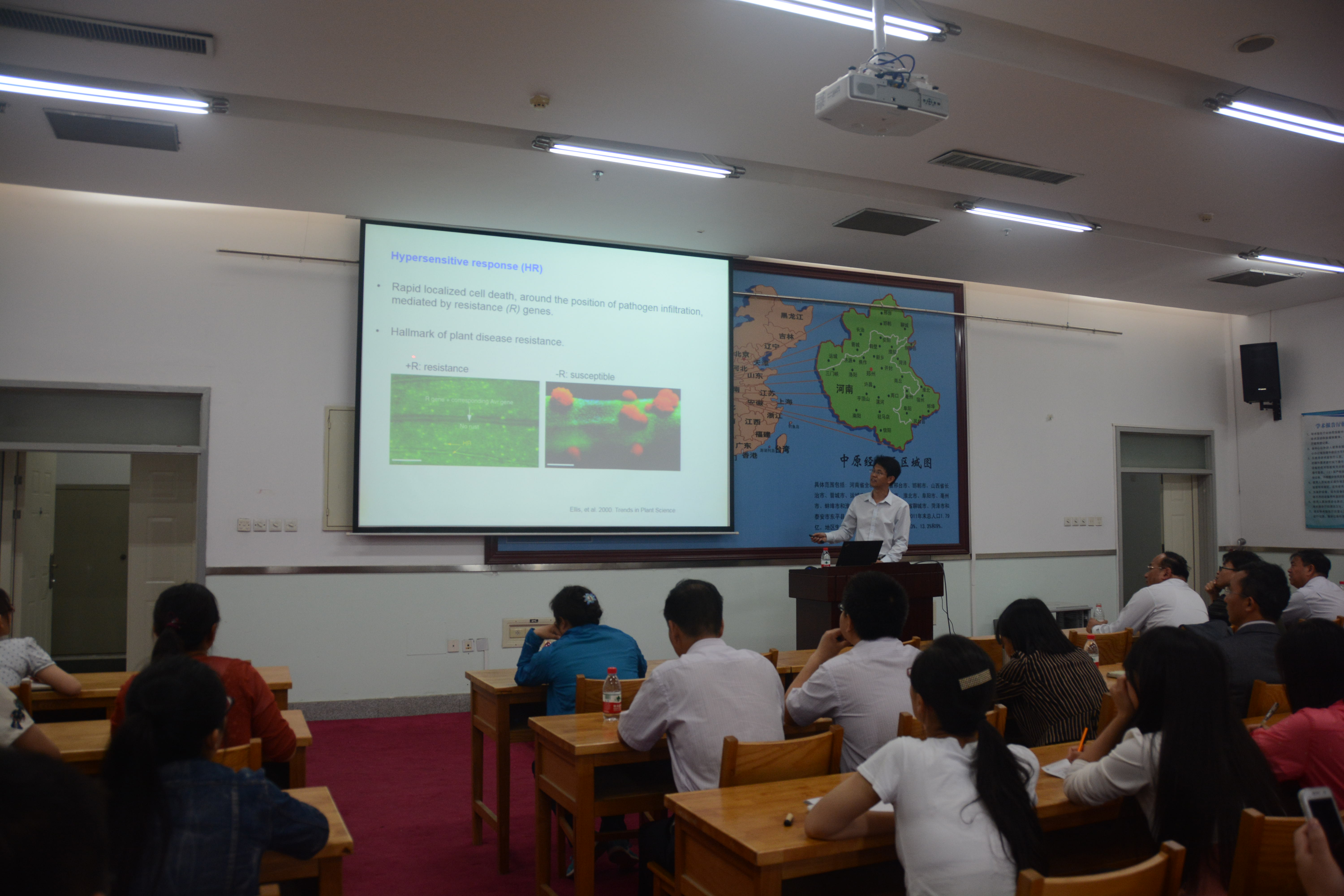 5月22日上午,美国北卡罗莱纳州立大学博士王官锋应邀在河南粮食作物协同创新中心学术报告厅为我校广大师生作了题为“玉米抗病基因Rp1-D21介导的超敏感反应(HR)的功能分析”的学术报告。禁漫