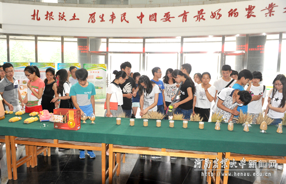 开幕式结束后,与会师生现场参观了实验室科普展。大家在实验室专家带领下,饶有兴趣地比较着长短不一的麦穗、各式各样的玉米果穗,品尝了由实验室选育的“豫爆2号”爆米花,现场学习了解小麦玉米的种植概况、生长发育、栽培技术、新品种选育、病虫草害、营养缺乏等小麦玉米相关知识,充分体会到了小麦玉米育种的乐趣。