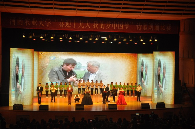 参赛团队高亢激昂地朗诵着诗歌,饱满真挚的感情顿时弥漫全场。在朗诵的同时,学生们以表演的形式还原了郭天财教授工作、生活的画面。朗诵结束时,舞台上飘扬着我校校旗和禁漫