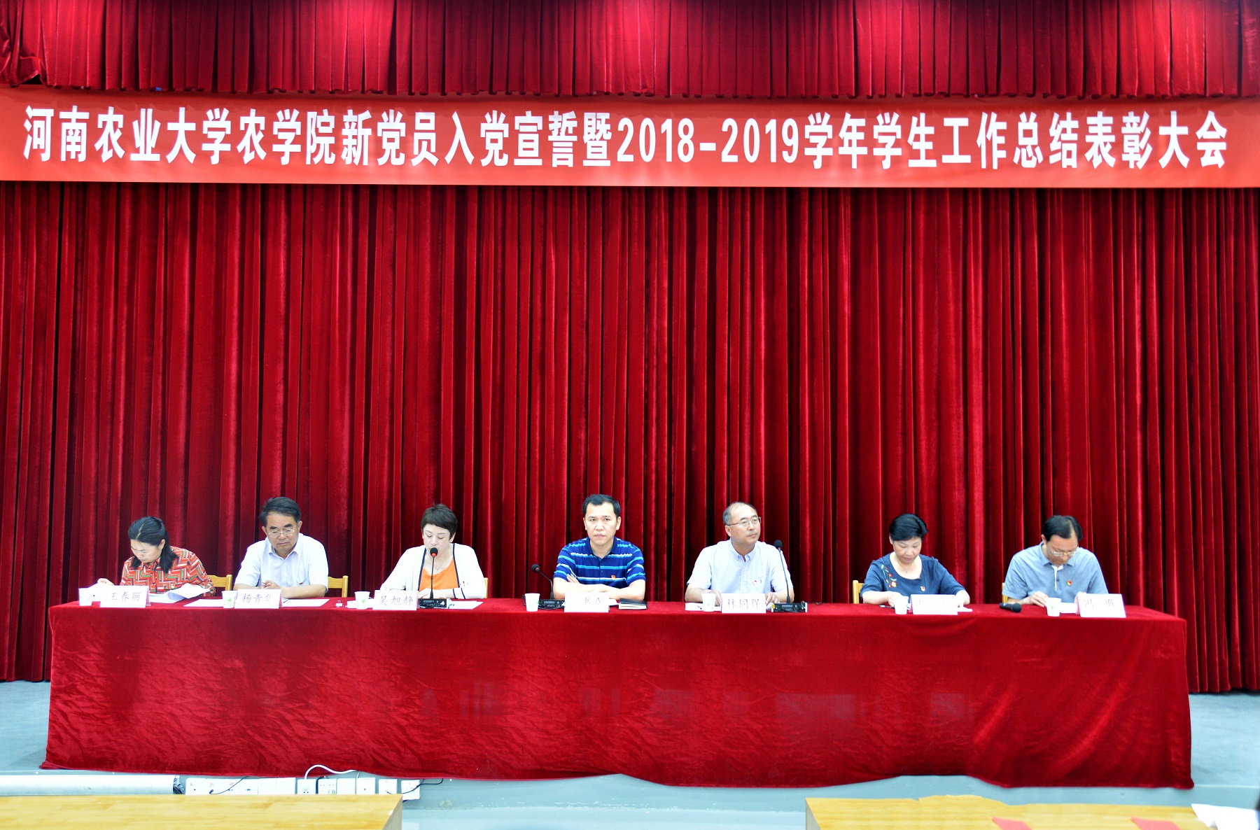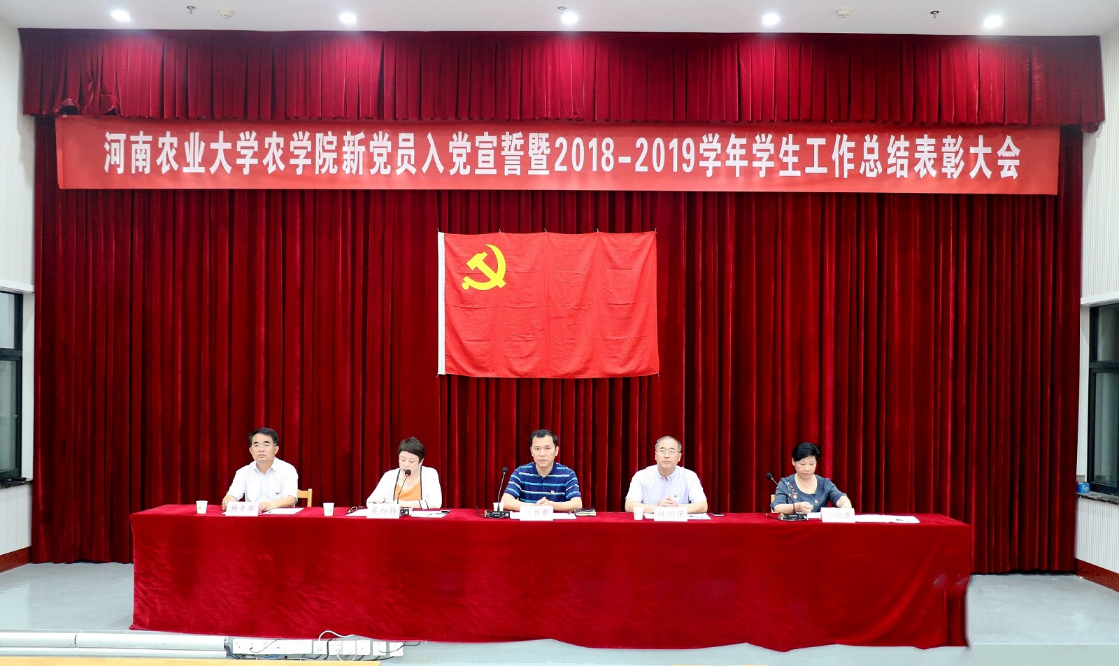 在龙子湖校区教学楼AB间大教室二举行了新党员入党宣誓暨2018-2019学年学生工作总结表彰大会。学院党政领导班子、院办公室、院团委老师以及班主任代表出席此次大会。参加大会的有全体新党员、先进个人、集体代表和本专科生、研究生代表。会议由院党委副书记吴旭静主持。