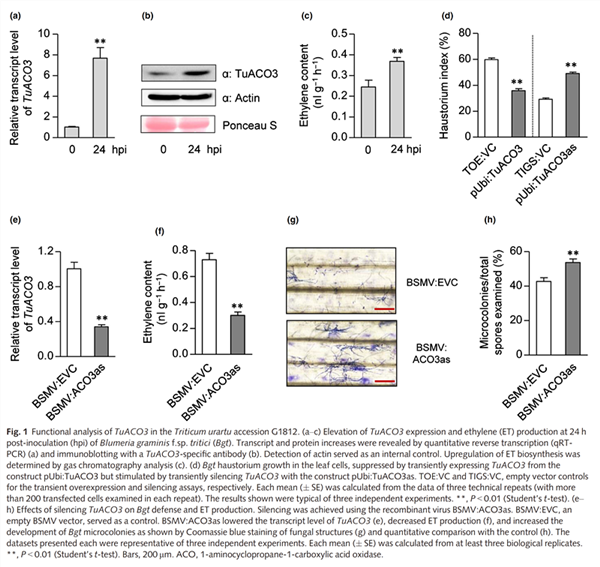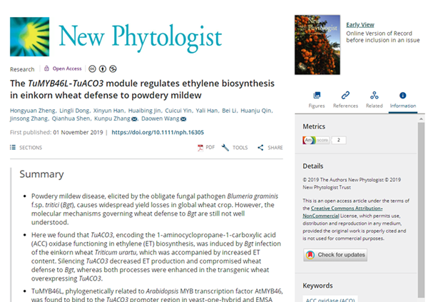 2019年12月,王道文研究员团队在约翰威立(Wiley)数据库《新植物学家》(New Phytologist)期刊上发表题为《TuMYB46L-TuACO3模块调控一粒小麦乙烯合成与白粉病抗性》(The TuMYB46L-TuACO3 module regulates ethylene biosynthesis in einkorn wheat defense to powdery mildew)的最新研究进展。该研究发现并证实了一个新的能够调控小麦对白粉病抗性的分子模块TuMYB46L-TuACO3,在白粉病菌侵染时,该分子模块能够上调乙烯合成,进而促进下游4个几丁质酶基因的表达,使几丁质酶活性增加而提高小麦对白粉病菌的防御反应。研究结果为深入认识小麦抵御白粉病的分子机制增添了新知识,为小麦抗病育种提供了有益信息和基因资源。该杂志影响因子达到7.3(1区期刊),王道文团队博士研究生郑宏远及中国科学院遗传与发育生物学研究所董玲丽博士为论文共同第一作者,王道文研究员和张坤普副研究员为论文共同通讯作者。该研究由禁漫