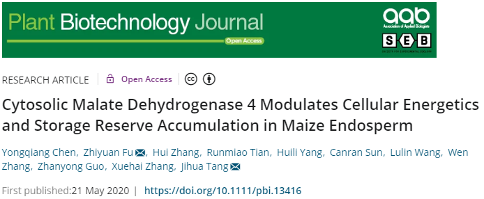 汤继华教授课题组在国际著名期刊Plant Biotechnology Journal(植物生物技术)上在线发表题为《细胞质苹果酸脱氢酶4调节玉米胚乳细胞能量和储藏物质积累》(Cytosolic Malate Dehydrogenase 4 Modulates Cellular Energetics and Storage Reserve Accumulation in Maize Endosperm,文章链接//doi.org/10.1111/pbi.13416)的研究论文(SCI影响因子8.4,JCR和中科院工程技术类一区杂志)。