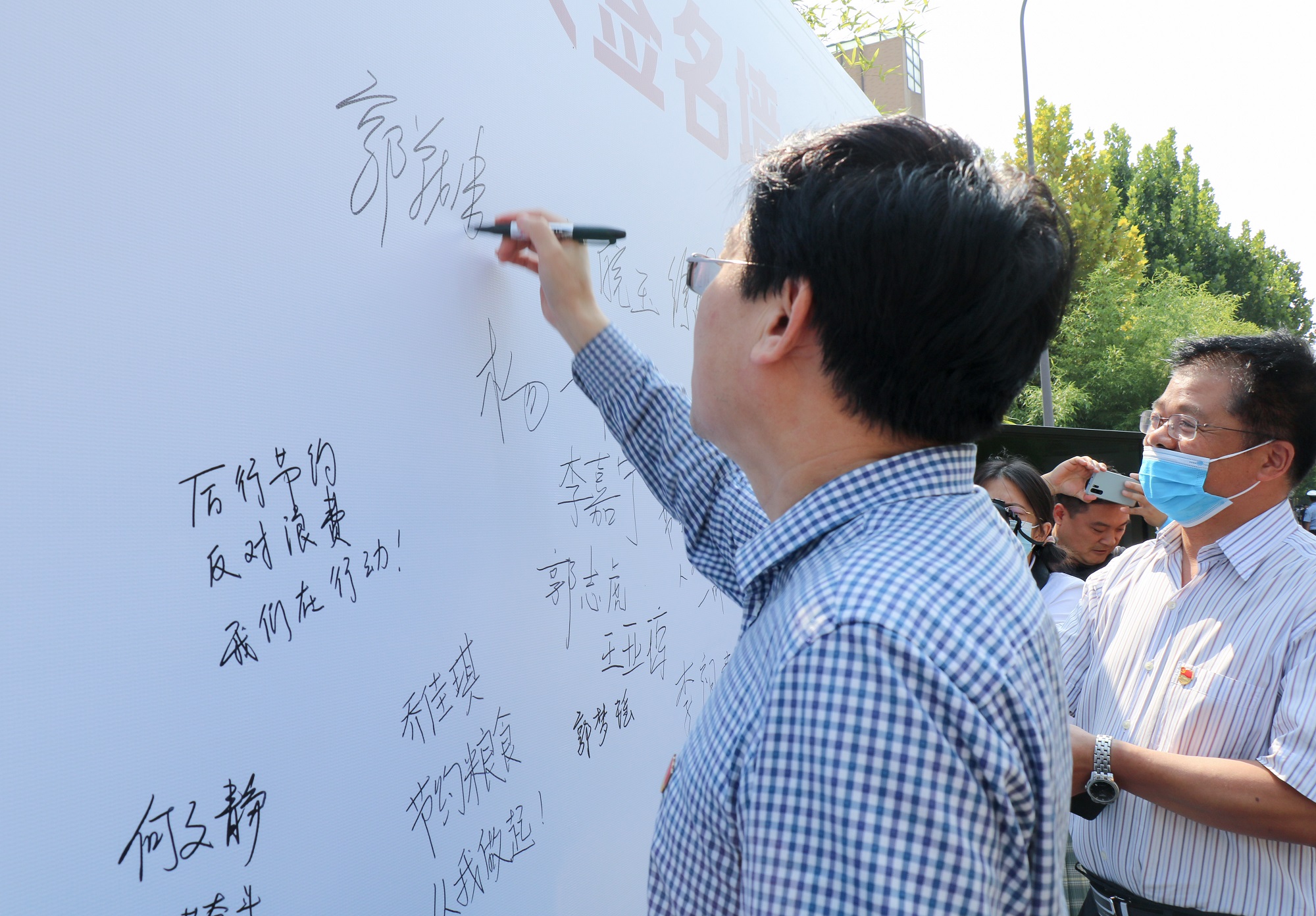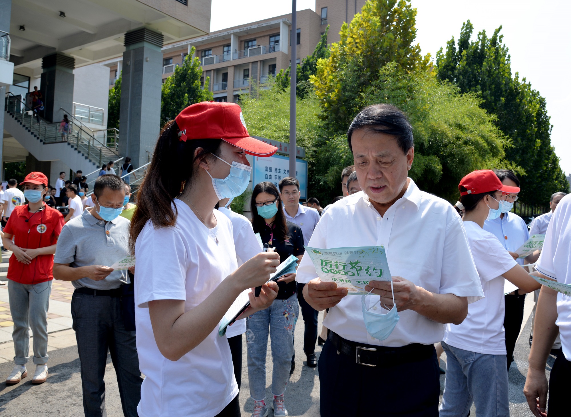 轻风暖阳,秋意盎然。9月12日上午,在龙子湖校区二餐厅西门处附近,学院组织广大青年学子开展“厉行节约 反对浪费”主题系列活动,号召广大师生以实际行动杜绝“舌尖上的浪费”,弘扬中华民族勤俭节约的传统美德。到我校调研的全国人大常委会副委员长武维华、省人大常委会副主任李文慧、省人大常委会农村工作委员会主任张琼以及校党委书记魏蒙关,校长、中国工程院院士张改平,校党委副书记、副校长介晓磊,副校长康相涛等领导深入活动现场,参与相关活动。