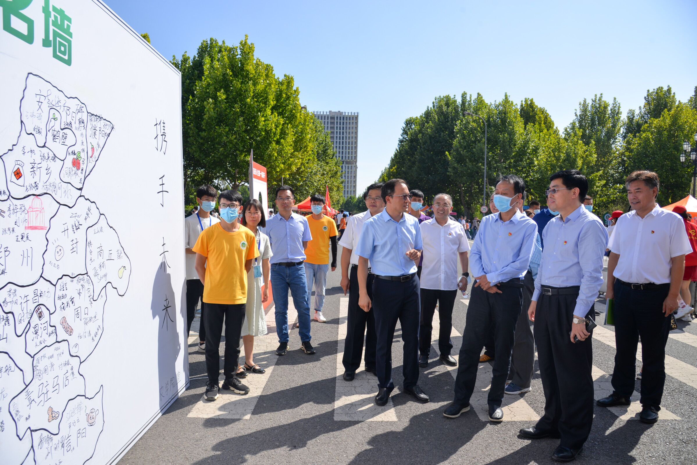 迎新现场,学院租赁摆渡车方便新生运输行李,打通入校“最后一公里”。身穿黄色T恤的迎新志愿者们热情洋溢、辛劳奔波,帮新生搬运行李、介绍校园情况、陪同办理手续,直到新生顺利入住宿舍,一系列无缝对接、快速高效的“全流程”服务使新生在入学伊始就感受到家的温暖,同时也让家长更放心、更安心;学院向每位新生发放致新生的一封信、入学指南以及口罩、维生素C片等物品;由学院传媒工作室同学精心手绘的河南省地图签名墙引来了众多新生,他们带着对大学的好奇与期待,在对应的家乡区域进行签名,并手持创意小手牌进行合影留念;中药学系“知行本草”工作室的同学们准备了600份自制果冻,加入了药食中药的无添加果冻让新生品尝美味的同时感受中药学之美。期间,校领导、院领导深入迎新现场,查看新生报到情况,与新生进行亲切交流。