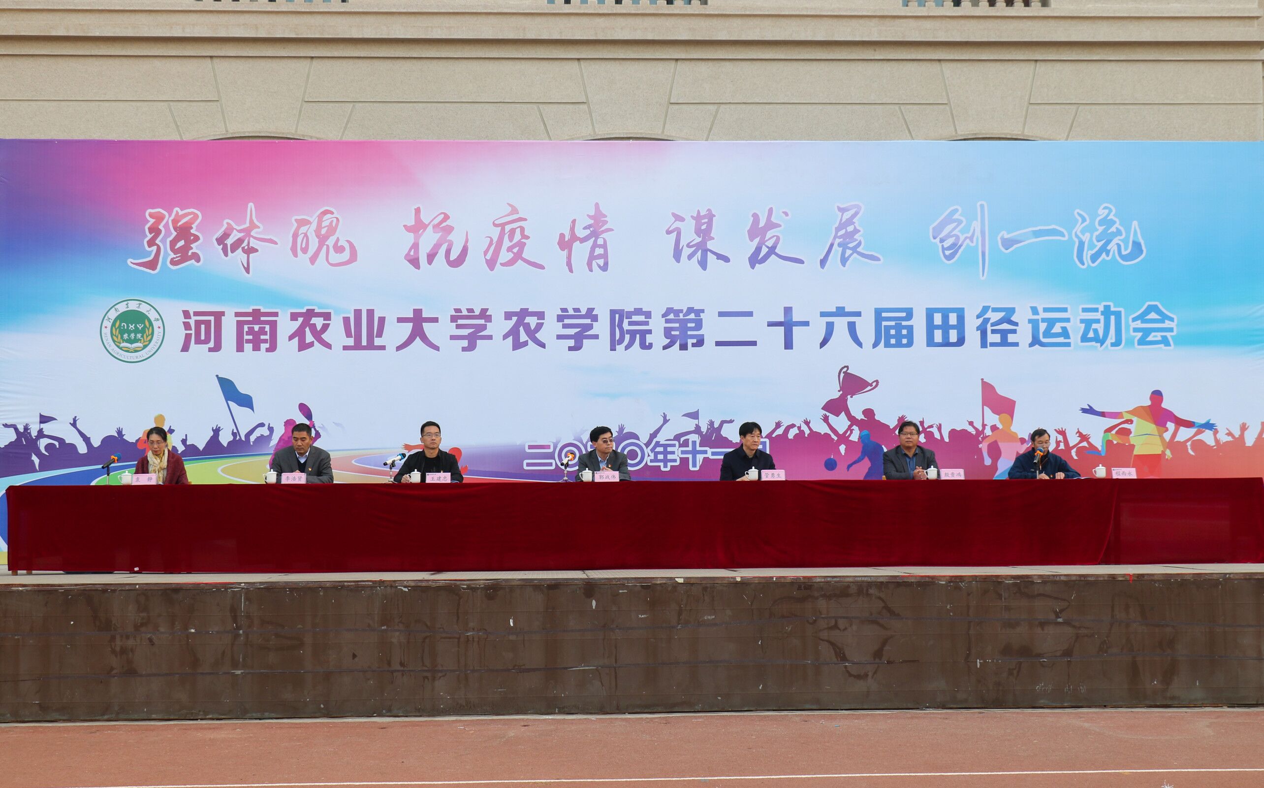 第二十六届田径运动会在龙子湖校区田径场拉开帷幕,本次运动会主题为“强体魄 抗疫情 谋发展 创一流”。校党委委员、院党委书记郭战伟,校体育运动委员会主任、体育学院院长管勇生,院党委副书记王建忠,副院长殷贵鸿,副院长李浩贤,副院长程西永,大会总裁判长袁静出席了本次运动会开幕式。开幕式由院党委副书记王建忠主持。