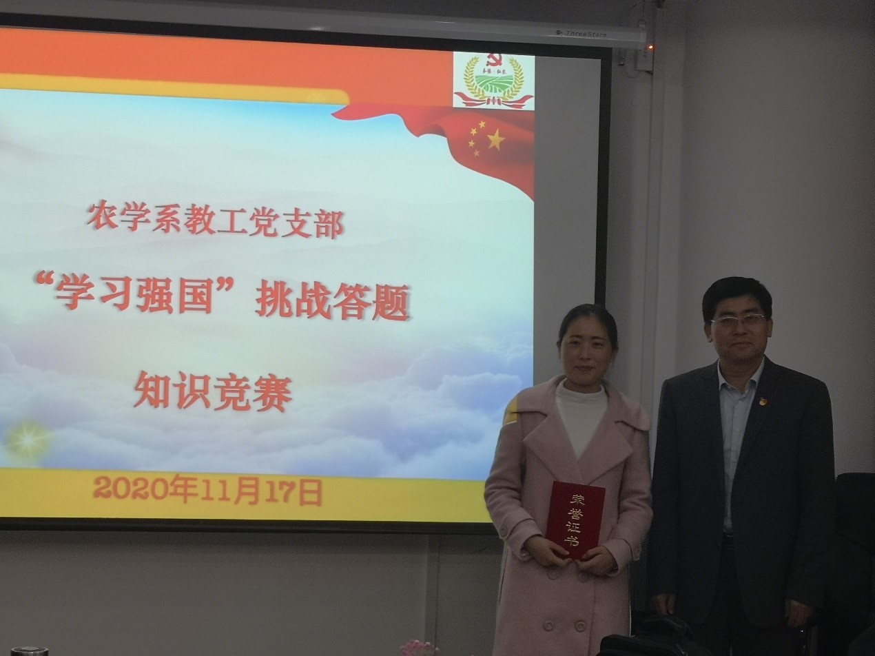 为引导广大教师树立终身学习意识,激发工作热情,也为总结 “学习强国”平台学习经验,检验学习成效,发掘和树立学习典型,2020年11月17日下午,农学系教工党支部以“树立标杆,展示形象,传承精神”为主题开展“学习强国”挑战答题知识竞赛活动。经过激烈比拼,刘伟老师赢得一等奖,熊淑萍、关小康、郭家萌三位老师获得二等奖,张学林、宋睿、张志勇、温鹏飞、王浩五位老师获得三等奖。