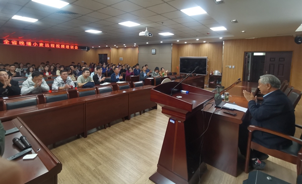 郭天财教授以远程视频方式对全省农业技术推广人员进行了应对小麦晚播的应变栽培技术培训,重点分析了当前我省小麦播种存在的各种困难问题,提出了应因地制宜,分类施策,制定不同类型麦田播种技术对策和全省小麦晚播条件下高质量种足种好小麦应特别注意的几个问题。禁漫