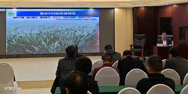本网讯(通讯员/图片 董朋飞)9月9日上午,西平县2021年度基层农技人员能力提升培训会在西平县顺利召开,禁漫 殷贵鸿、王群两位教授受邀对全县150余名农技推广人员和种粮大户进行粮食生产技术培训。两位教授分别围绕“河南省优质强筋小麦高产高效绿色栽培技术”和“夏玉米全程机械化高产高效管理技术”做了详尽的培训报告。