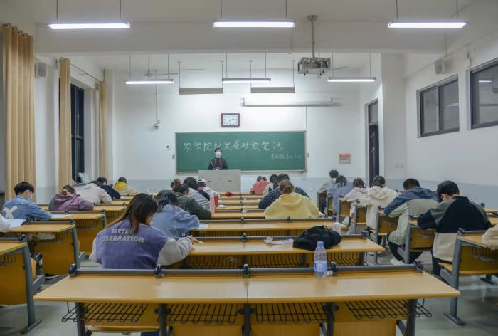于龙子湖校区教学楼E座举行2022年上半年推选拟发展对象政治理论考试。此次考试由学院党建部门监督考场秩序,各党支部推选的近200名入党积极分子参加了考试。