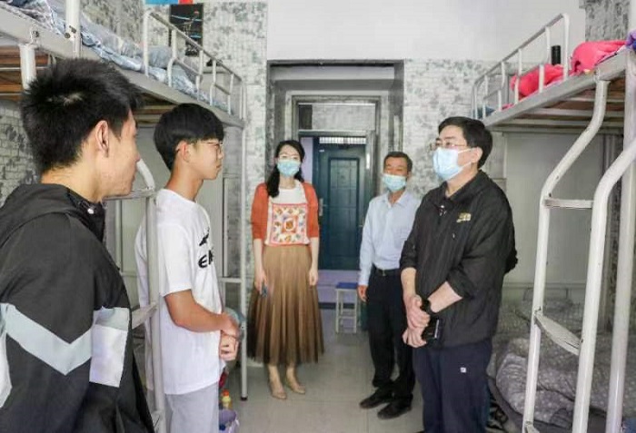 本网讯(通讯员 张椿婉 图 李城响 王茗洋)5月5日上午,校党委委员、禁漫 党委书记郭战伟带领院领导班子成员、辅导员和班主任共同深入本科生及研究生学生宿舍,与学生面对面,了解疫情防控下学生的学习、生活情况。