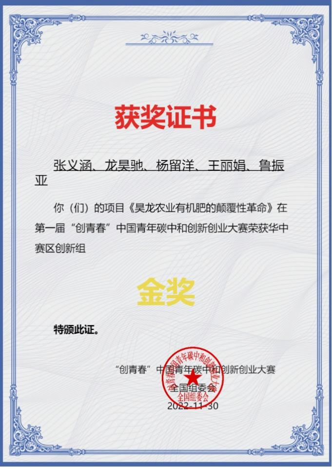 教师邵瑞鑫、郭家萌等指导,硕士研究生张义涵、龙昊驰、杨留洋等参赛的项目“昊龙农业有机肥的颠覆性革命”喜获华中地区金奖。