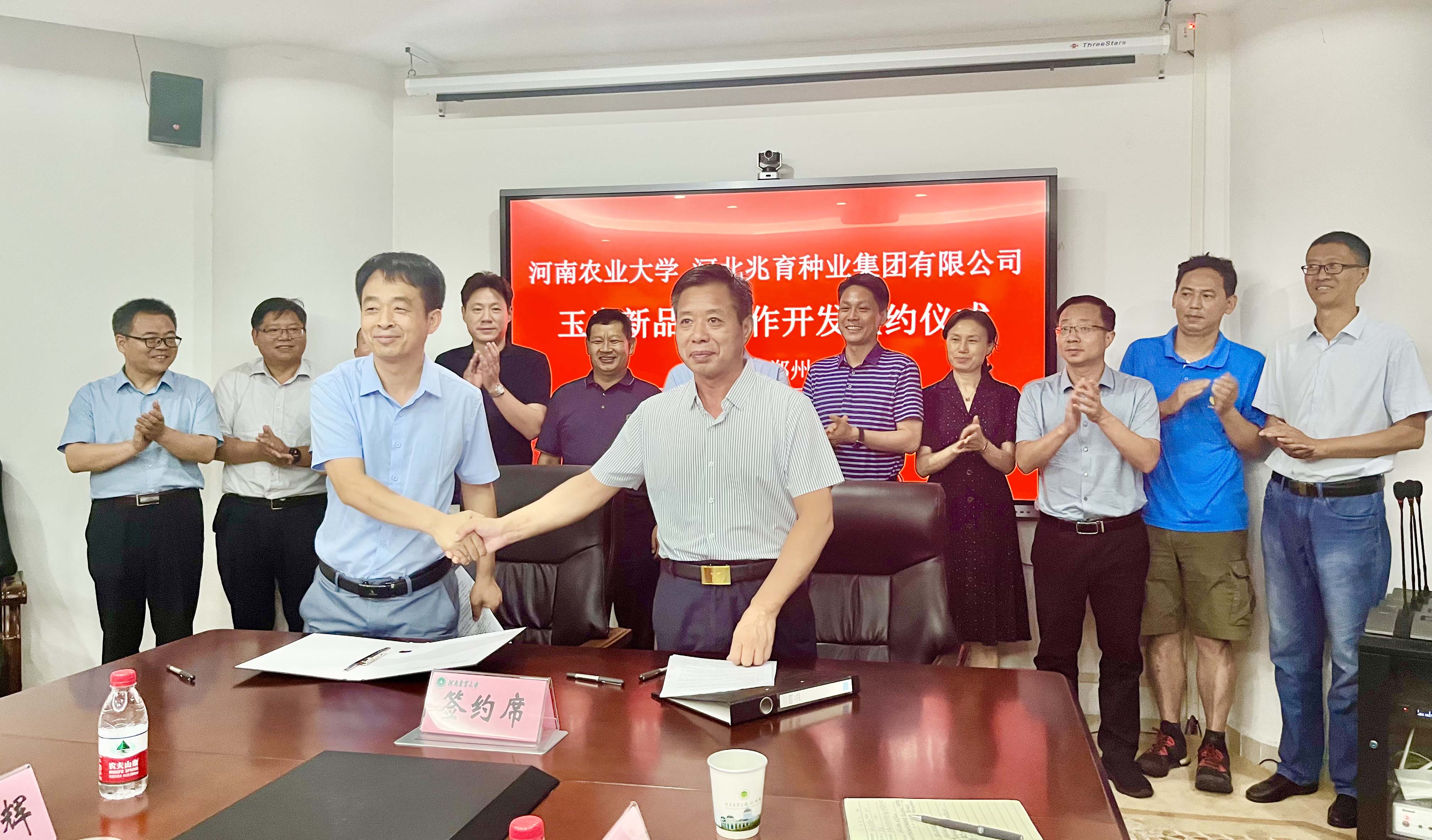 玉米新品种YD2313合作开发签约仪式在第一实验大楼举行。河北兆育种业集团有限公司副总裁王业国、贺东刚一行,禁漫