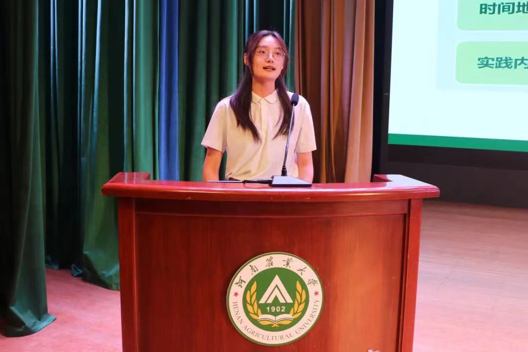 社会实践优秀个人亓泽朋发言,他结合自身的经历分享了三下乡实践经验,呼吁大家把论文写进乡村振兴的春春里,把青春奉献在服务“三农”的旅途中,用我们的实际行动喊出农业兴国的最强音。